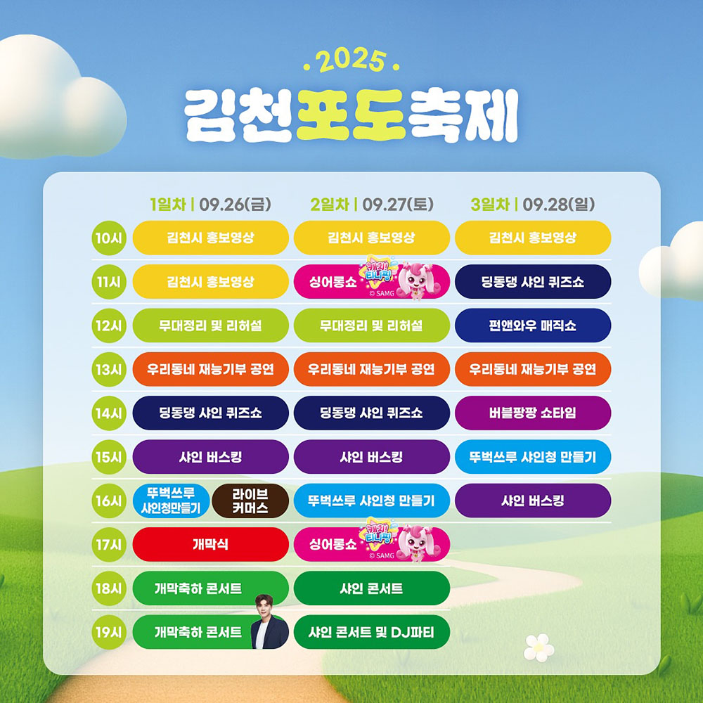 ○ 대표 프로그램: 개막축하 콘서트, 샤인 콘서트, 캐치! 티니핑 싱어롱쇼, 샤인 버스킹, 포도 디저트 카페, 나이트 샤인런, 뚜벅쓰루 샤인청 만들기